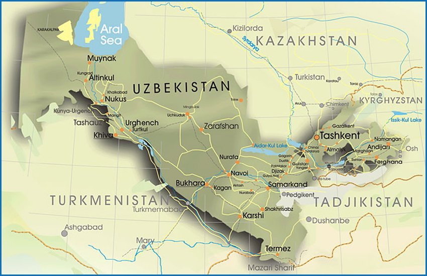 Tashkent-Urgench-Khiva-Bukhara-Nurata-Yanghikazgan-Aydarkul-Samarkand-Shakhrisabz-Samarkand-Tashkent